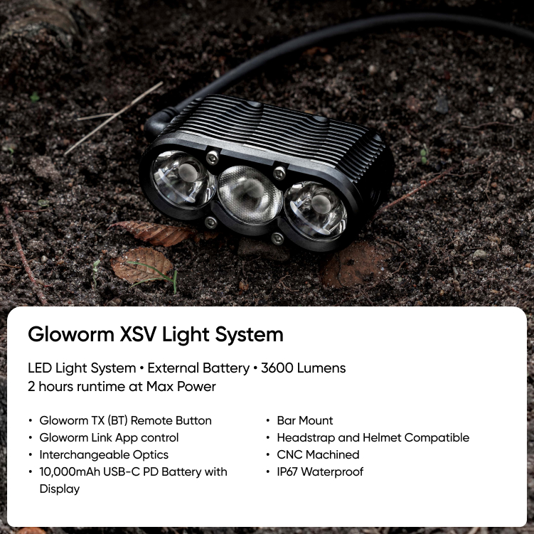 The XSV Light System (G2.1) delivers unmatched output and performance. Combining our brightest light head with a high-capacity 10,000mAh battery, it provides 2 hours runtime at maximum power and 12+ hours runtime at 20% power (720 lumens). Its compact form factor and versatile mounting options give you the freedom to position your light exactly where you need it. The XSV will transform the way you ride at night.
